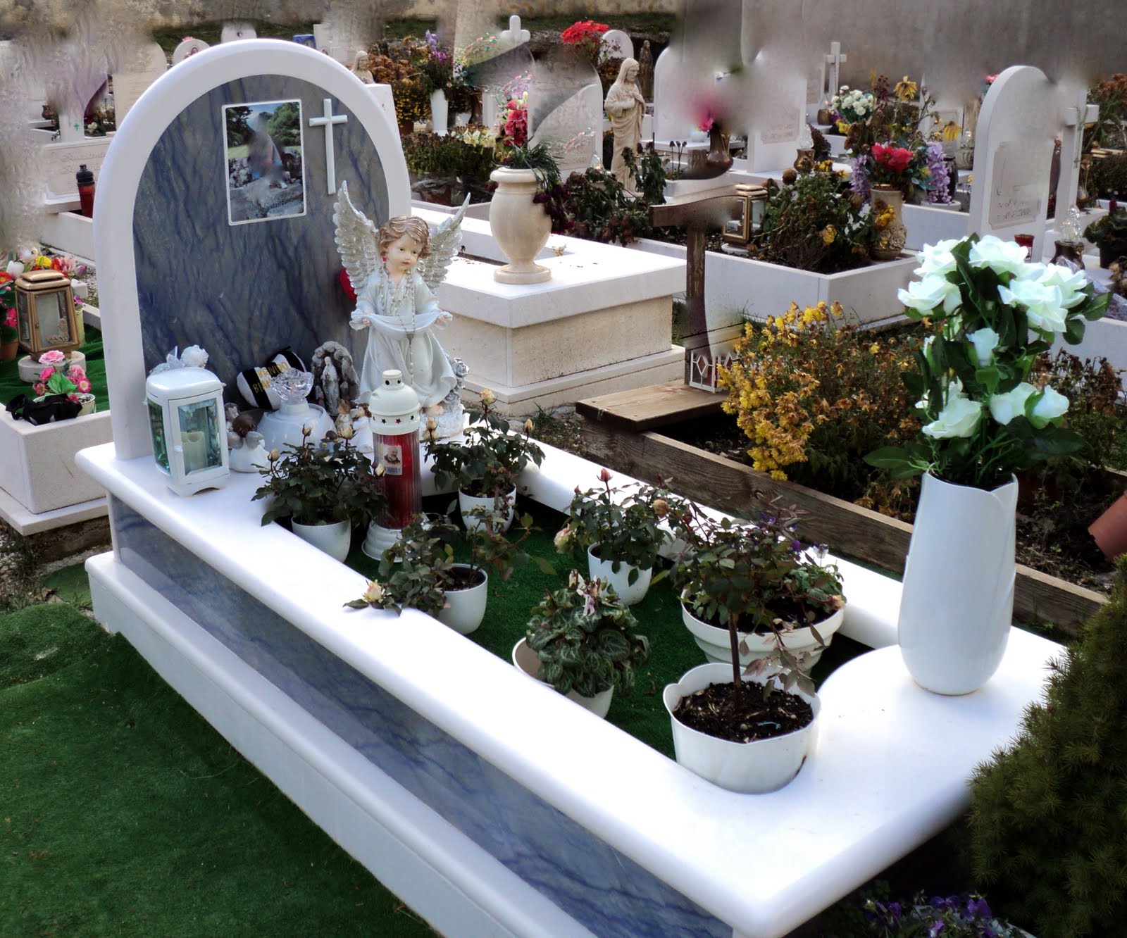 In queste immagini vengono ritratte due tombe. La prima, vista da davanti e da dietro, è realizzata in Azul Macaubas e bianco Taxos. Nomi e foto sono stati volutamente oscurati per il rispetto delle norme sulla privacy.