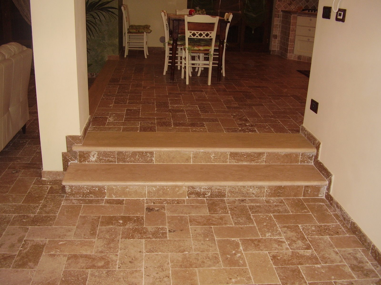 Queste immagini ritraggono una scala in travertino paglierino levigato e l’antistante pavimento in travertino noce con listelli a spina di pesce (formato 30 x 7,5).